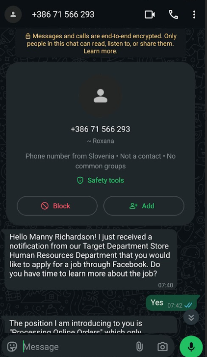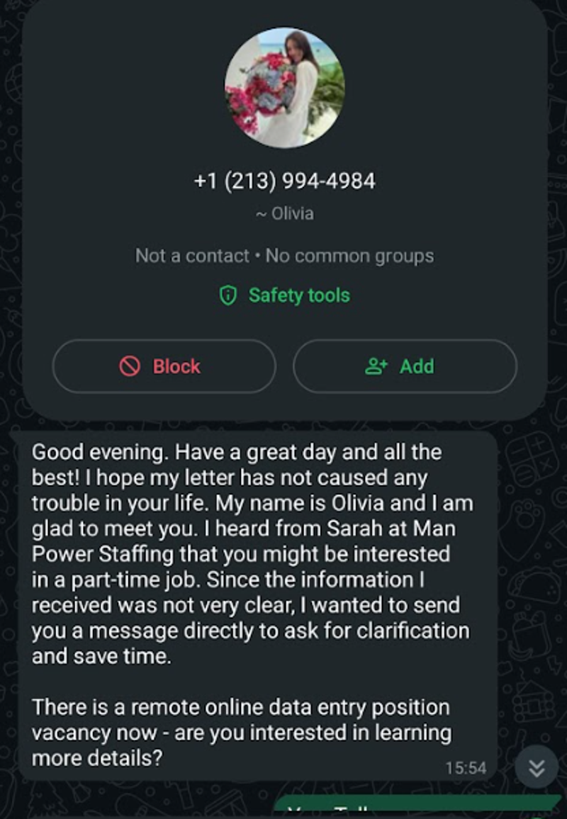 Recruiters from India. Recruiters that use untraceable apps such as WhatsApp are most likely scams.